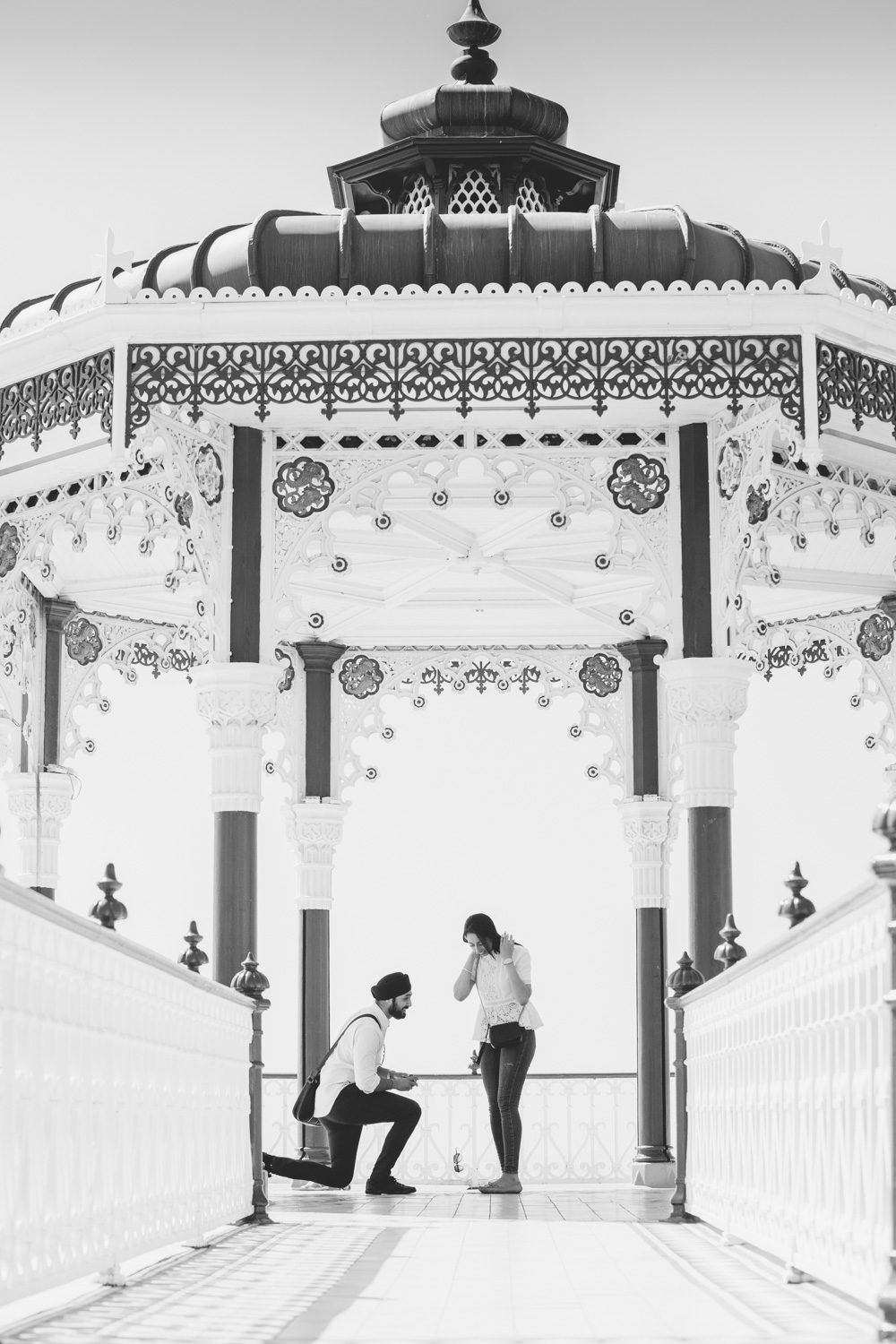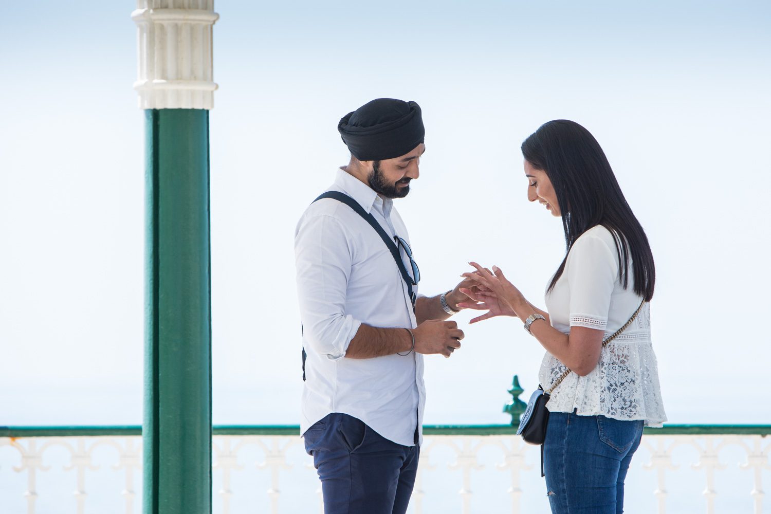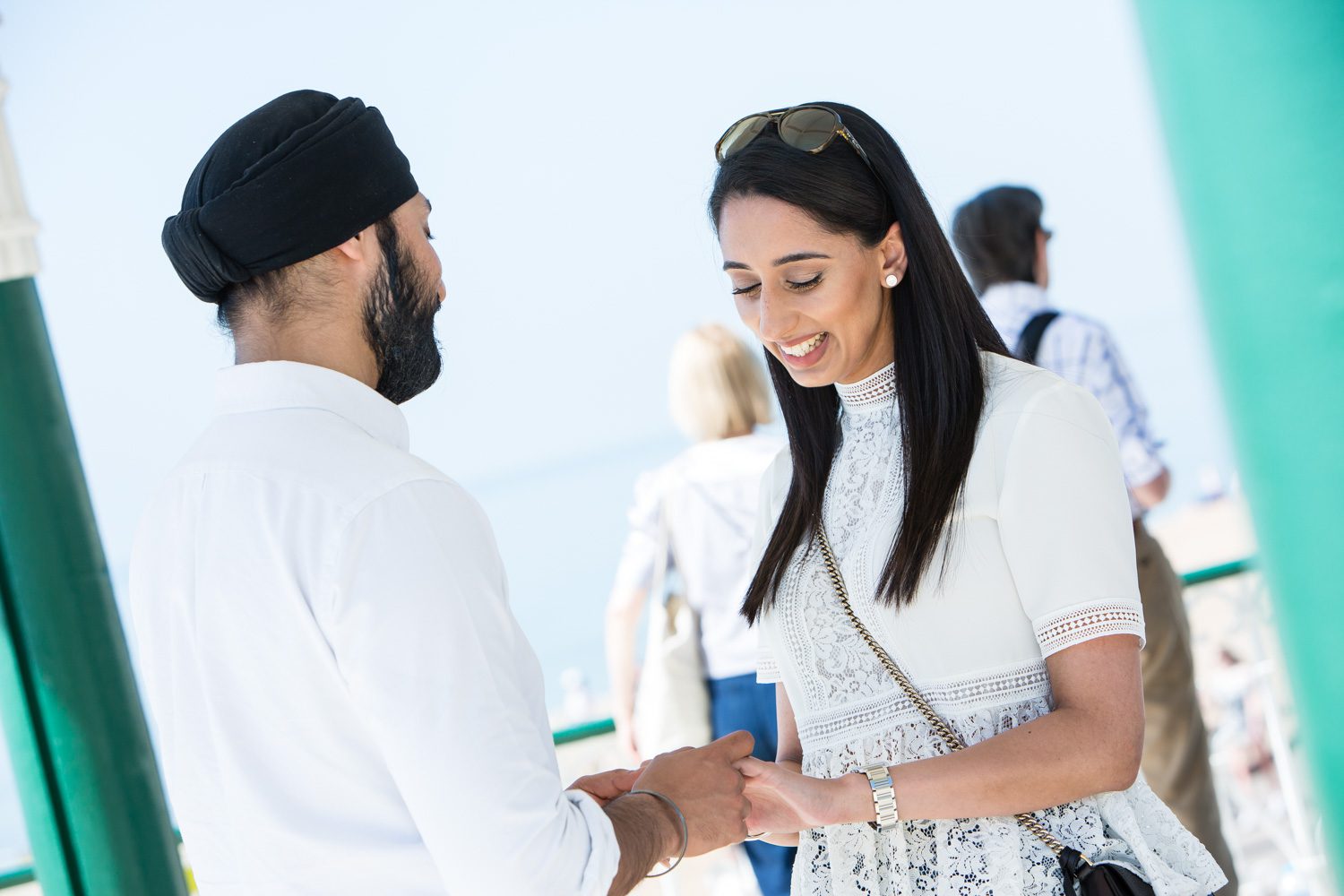 I met Joginder at the bandstand a week before the surprise to discuss the plan. We needed to arrange how he’d secretly text me as they arrived from London and were approaching the bandstand, where he would stand to pop the big question and how I’d already be waiting there pretending to get that perfect shot of the ruin of the West Pier. Both from London, they had had their first date here years ago so Joginder thought it would be perfect to come back to propose. And it was.