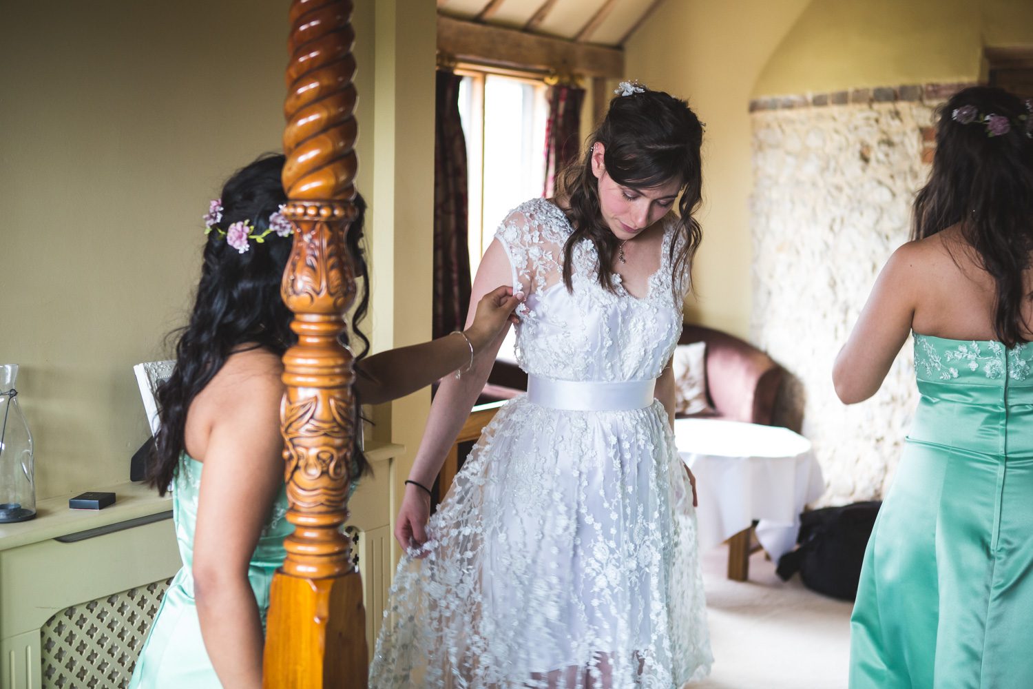 I photographed Gemma and her bridesmaids getting ready at the beautifully serene cottages of Frasers at Coldharbour Farm in Egerton. Despite it being the morning of her wedding, Gemma seemed just as relaxed as the day we met at the wedding fair. It was all good. The gentle flowers adorning Gemma’s bespoke dress made it simple and beautiful and her shoes of choice were flip-flops. An elegant young woman who just knew she had to be comfy. It seemed just right.