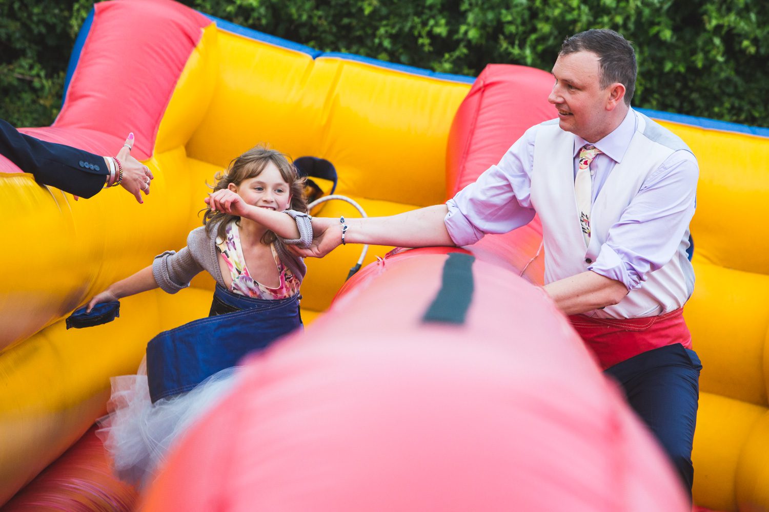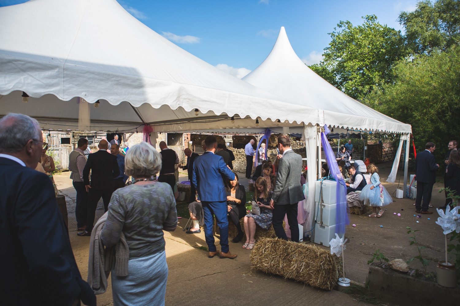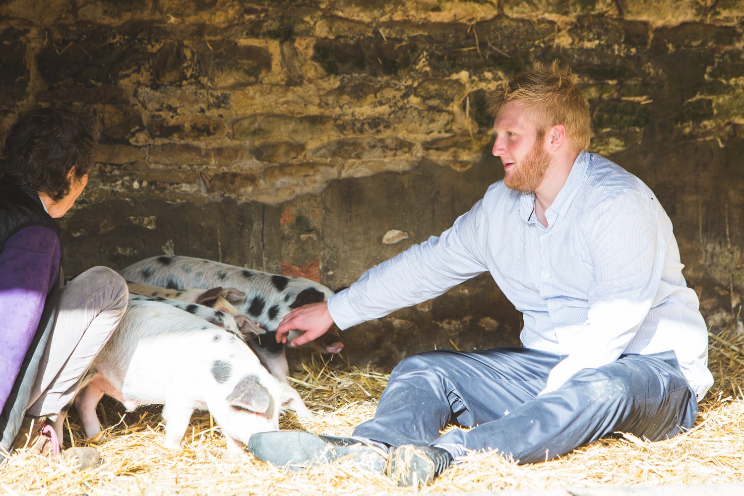 It had it all. Vibrant flowers sprouting from wellie-boots adorning a touching church ceremony; a confetti shower of pom-poms knitted by Fliss herself as they arrived for their reception at Sandy Lane Farm; afternoon tea served in the ancient barn; guests climbing in with the pigs for a cuddle; an ice-cream van; couple portraits on a tractor; rodeo riding, bungee running and a bouncy castle!